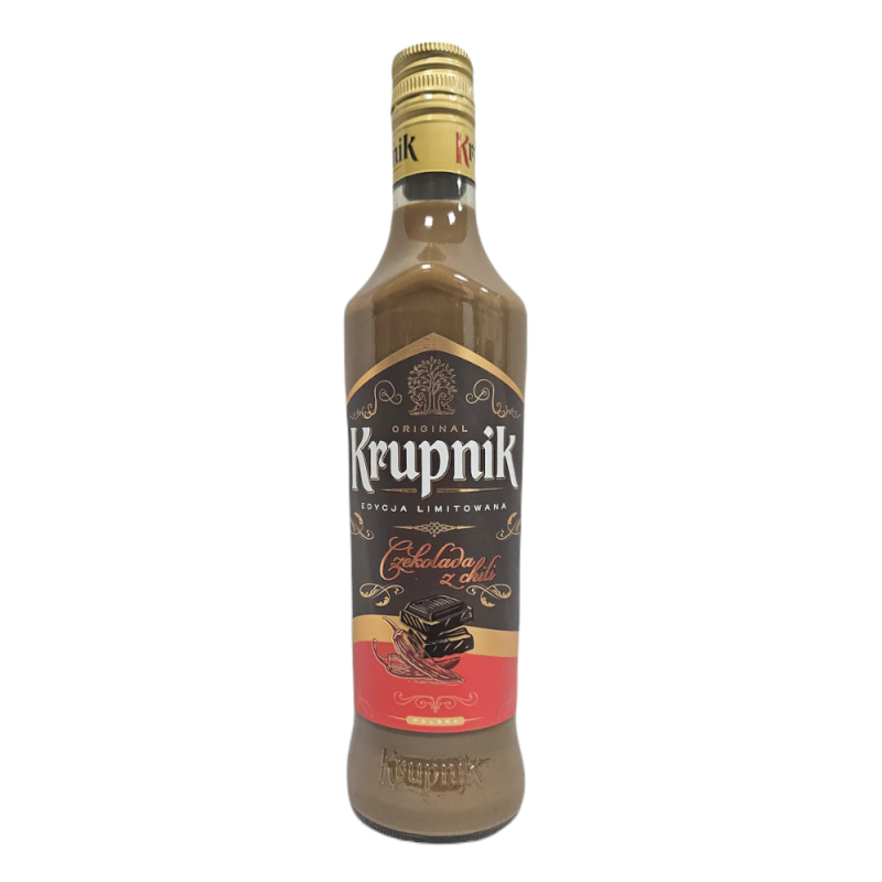 Krupnik czekolada z chili 0,5l, to mleczny likier na bazie mleka, czekolady z dodatkiem chili który jest wytwarzany wyłącznie z naturalnych składników. Podawać jako dodatek do kawy lub deserów.