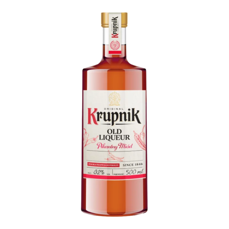 Krupnik Old Liqueur Pikantny Miód to wyjątkowy polski likier o tradycyjnej recepturze, który łączy w sobie naturalny miód z korzennymi przyprawami, tworząc harmonijną kompozycję smakową. Likier wyróżnia się intensywnym aromatem miodu, wzbogaconym o nuty korzenne i delikatną pikantność, co nadaje mu głębi i złożoności. Krupnik Old Liqueur Pikantny Miód to trunek, który łączy w sobie tradycję z nowoczesnością, oferując wyjątkowy smak i aromat. Idealny dla miłośników słodkich likierów z nutą korzenną.