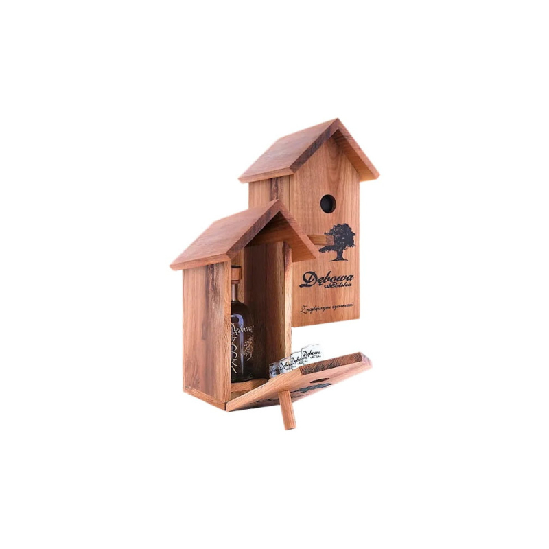 Dębowa Polska budka dla ptaków powstała z myślą o miłośnikach natury. Producent umieścił wewnątrz gustownego domku butelkę polskiej wódki, a całości dopełniają 4 kieliszki. Kompletny zestaw pozwoli uczcić dowolną okazję, zwłaszcza na świeżym powietrzu.